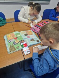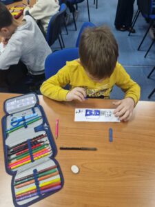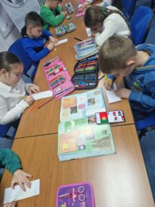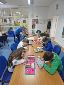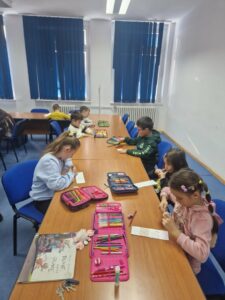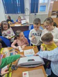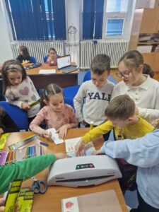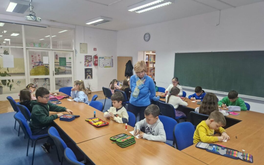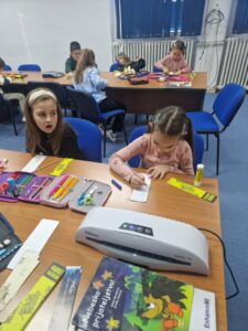 Jučer su učenici 1. a razreda s učiteljicom Jasnom Brečić posjetili školsku knjižnicu. Kao ovogodišnji sudionici Međunarodnog projekta razmjene bookmarkera (straničnika) naši vrijedni prvaši sudjelovali su u radionici izrade straničnika koju je za njih osmislila školska knjižničarka.