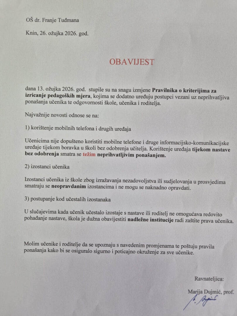 Dana 13. ožujka 2026. god. stupile su na snagu izmjene Pravilnika o kriterijima za izricanje pedagoških mjera, kojima se dodatno uređuju postupci vezani uz neprihvatljiva ponašanja učenika te odgovornosti škole, učenika i roditelja.