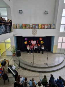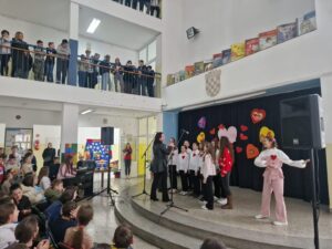 Danas je u našoj školi održana priredba povodom Valentinova – dana kada slavimo ljubav, sramežljive poglede, zaljubljene osmijehe i leptiriće u trbuhu koji nam govore da nam je netko posebno drag. U holu škole okupili su se učenici, učitelji i roditelji kako bi zajedno uživali u