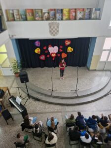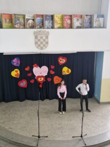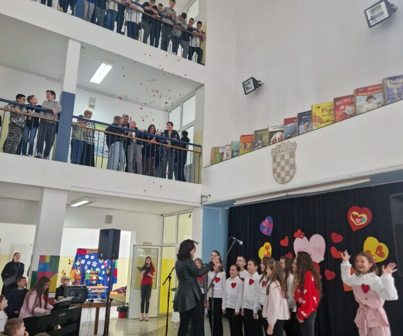 Danas je u našoj školi održana priredba povodom Valentinova – dana kada slavimo ljubav, sramežljive poglede, zaljubljene osmijehe i leptiriće u trbuhu koji nam govore da nam je netko posebno drag. U holu škole okupili su se učenici, učitelji i roditelji kako bi zajedno uživali u